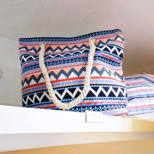 Confeccionado en lona de alta calidad, este bolso presenta un atractivo estampado tribal en zigzag que añade un toque bohemio y fresco a cualquier look. Sus asas gruesas de cuerda náutica no solo le dan carácter, sino que son cómodas de llevar en el hombro o en la mano, incluso con carga.